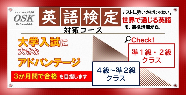 英検の出題傾向を軸とした講座内容。英検4級、3級、準2級クラスの3クラスで、OSK中学生クラスの在籍生対象の講座です。