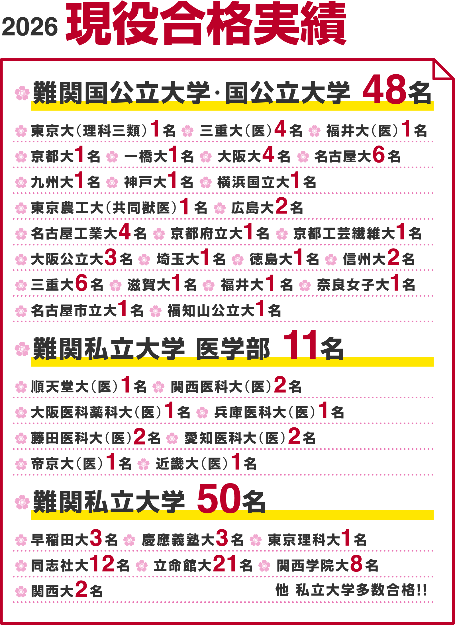 私は3年制で周りに難関大を目指す人が少ないコースですが、高3の夏から受講したスーパー数学では、堀先生の丁寧な指導のもと、質問にも親身に答えていただき、自分の得意である数学をさらに伸ばすことができました。難関大の過去問に取り組む中で応用力が鍛えられ、自分の課題も明確になり、大きな成長につながったと感じています。共通テストでは思うような結果が出ず、志望校を下げることとなりましたが、名古屋工業大学に合格できたのはOSKのおかげです!